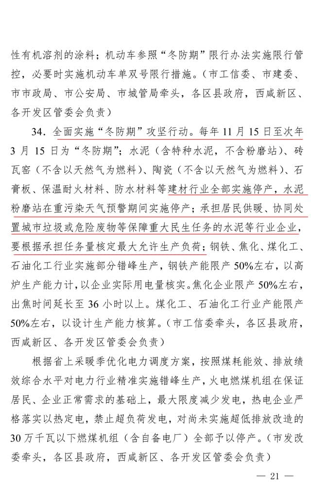全面實(shí)施“冬防期”攻堅(jiān)行動(dòng)。每年 11 月 15 日至次年 3 月 15 日為“冬防期”;水泥(含特種水泥,不含粉磨站)、磚瓦窯(不含以天然氣為燃料)、陶瓷(不含以天然氣為燃料)、石膏板、保溫耐火材料、防水材料等建材行業(yè)全部實(shí)施停產(chǎn),水泥粉磨站在重污染天氣預(yù)警期間實(shí)施停產(chǎn);承擔(dān)居民供暖、協(xié)同處置城市垃圾或危險(xiǎn)廢物等保障重大民生任務(wù)的水泥等行業(yè)企業(yè),要根據(jù)承擔(dān)任務(wù)量核定最大允許生產(chǎn)負(fù)荷;鋼鐵、焦化、煤化工、 石油化工行業(yè)實(shí)施部分錯(cuò)峰生產(chǎn),鋼鐵產(chǎn)能限產(chǎn) 50%左右,以高 爐生產(chǎn)能力計(jì),以企業(yè)實(shí)際用電量核實(shí)。焦化企業(yè)限產(chǎn) 50%左右, 出焦時(shí)間延長至 36 小時(shí)以上。煤化工、石油化工行業(yè)產(chǎn)能限產(chǎn) 50%左右,以設(shè)計(jì)生產(chǎn)能力核算。