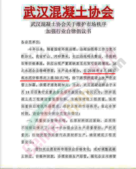【水泥人網(wǎng)】8月20日,武漢混凝土協(xié)會發(fā)布倡議書,呼吁各會員單位維護市場秩序,加強行業(yè)自律。倡議書稱,今年以來,隨著國家環(huán)保治理、治超治限等工作力度不斷加大,省內(nèi)礦山、河砂禁采,長江沿線碼頭整治,導致砂石等價格暴漲,供應出現(xiàn)緊缺甚至無貨可供。