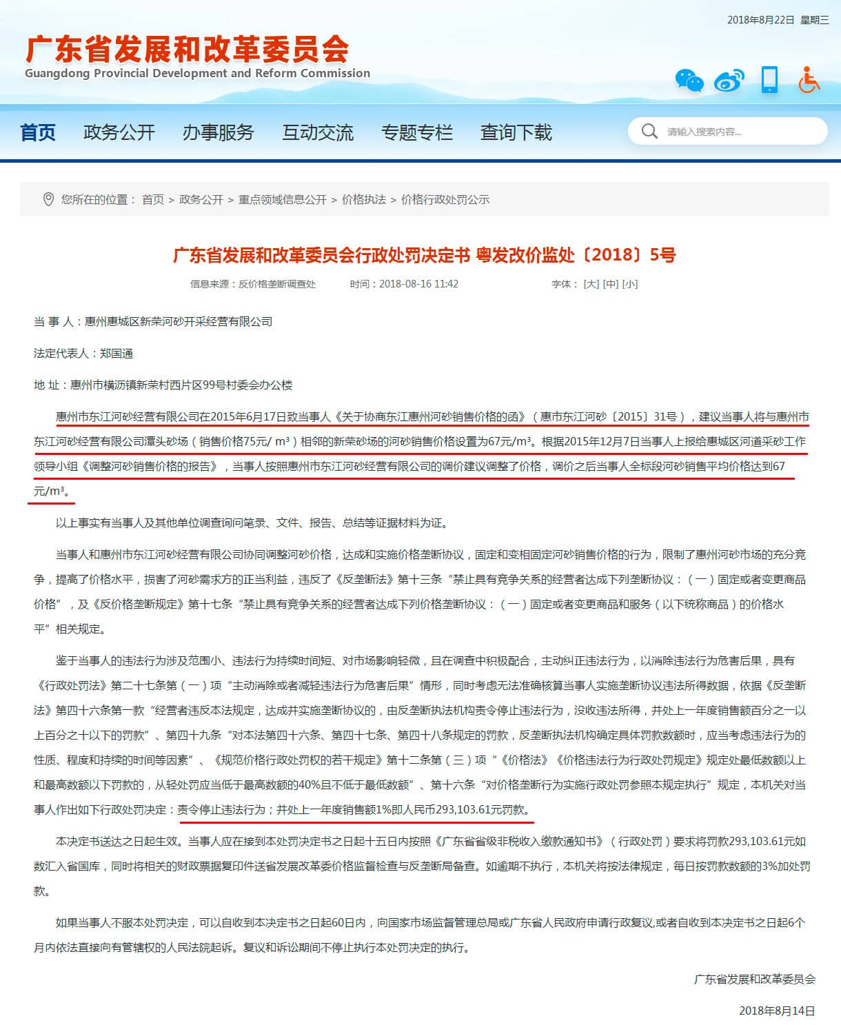 【水泥人網(wǎng)】日前,廣東省發(fā)改委發(fā)布行政處罰決定書(粵發(fā)改價(jià)監(jiān)處〔2018〕5號(hào)),責(zé)令惠州惠城區(qū)新榮河砂開采經(jīng)營(yíng)有限公司停止違法行為;并處上一年度銷售額1%即人民幣293,103.61元罰款。