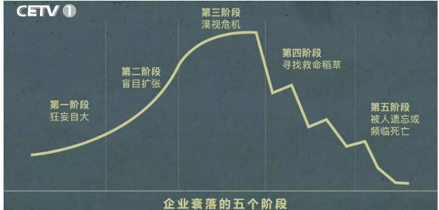 第一階段就是狂妄自大。他認為一個企業(yè)獲得一些成功,但如果一個企業(yè)不能對成功有一個正確的認識,放棄了最初的價值觀和管理準則,認為自己已經(jīng)無所不能,那這個時候就會狂妄自大。這讓想起了我在2012年,獲得經(jīng)濟年度人物時,郭鶴年老先生在臺上講的一段話,他說我們常講失敗是成功之母,實際上成功也是失敗之母,就是成功了以后要特別的小心,因為成功了往往失敗就開始了。所以這本書里他講為什么狂妄自大?他忽視了成功是多個因素構(gòu)成的,他只想是因為有神一樣的領(lǐng)導(dǎo),做出了一個英明決策,所以成功了,就開始狂妄自大。這往往是一個卓越企業(yè)墜落的第一個階段。