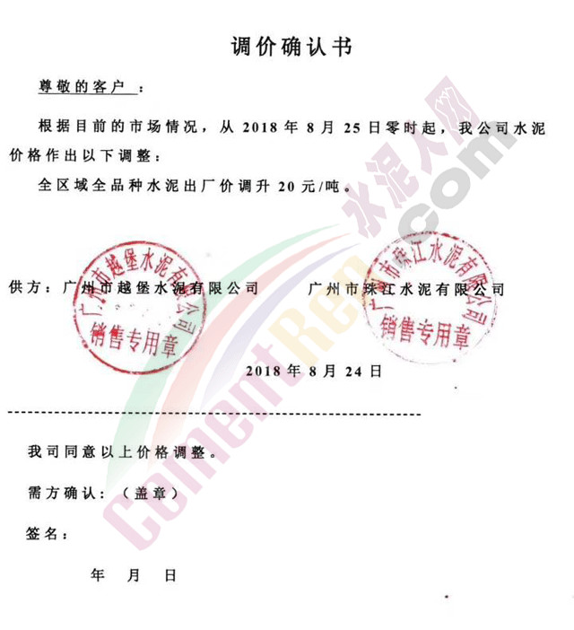 廣州市越堡水泥有限公司,廣州市珠江水泥有限公司調(diào)價(jià)確認(rèn)書稱,根據(jù)目前的市場情況,從2018年8月25日零時(shí)起,公司水泥價(jià)格全區(qū)域全品種上調(diào)20元/噸。