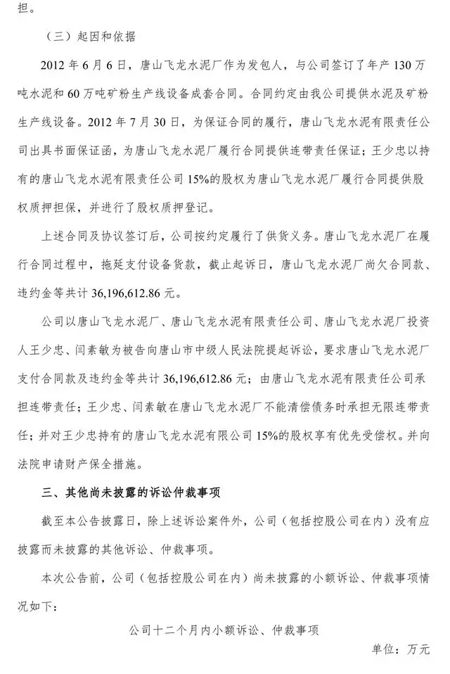 唐山飛龍水泥廠在履行合同過(guò)程中,拖延支付設(shè)備貨款,公司請(qǐng)求判令唐山飛龍水泥廠支付公司合同款、違約金等合計(jì)3619.66萬(wàn)元;由唐山飛龍水泥有限責(zé)任公司對(duì)上述債務(wù)承擔(dān)連帶清償責(zé)任。