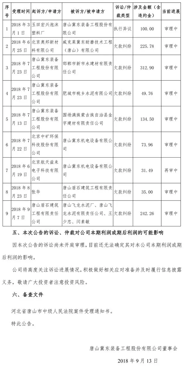 冀東裝備(000856)9月12日晚公告,9月12日,唐山市中級(jí)人民法院受理了公司訴唐山飛龍水泥廠、唐山飛龍水泥有限責(zé)任公司、王少忠、閆素敏買賣合同糾紛一案。
