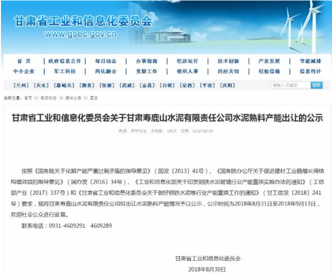 據(jù)水泥人網(wǎng)了解甘肅省工業(yè)和信息化委員會(huì)曾在8月30日發(fā)布《關(guān)于甘肅壽鹿山水泥有限責(zé)任公司水泥熟料產(chǎn)能出讓的公示》,公示時(shí)間為公示時(shí)間為2018年8月31日至2018年9月13日。