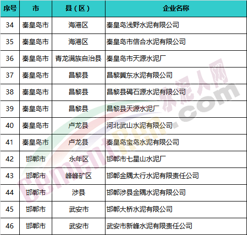 秦皇島市、邯鄲市重點(diǎn)排污水泥企業(yè)名錄