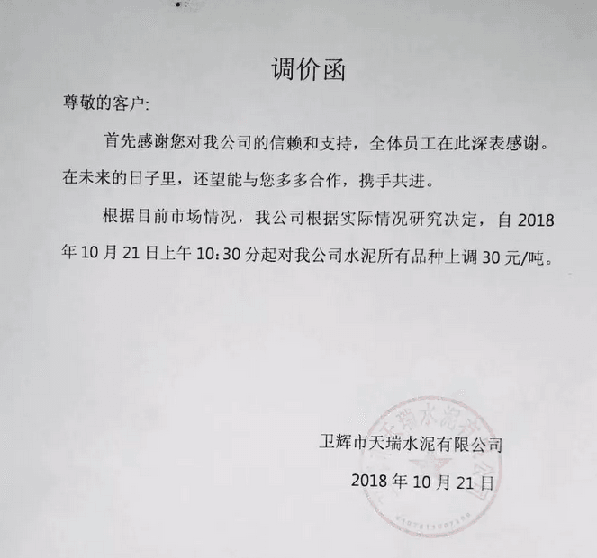 衛(wèi)輝市天瑞水泥有限公司在調(diào)價函中決定對公司水泥所有品種上調(diào)30元/噸。