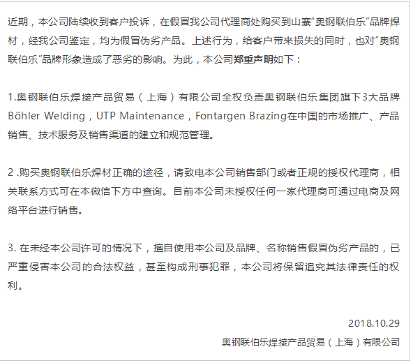 再次感謝用戶朋友對(duì)奧鋼聯(lián)伯樂(lè)焊接長(zhǎng)久以來(lái)的信任與支持,請(qǐng)通過(guò)正規(guī)途徑購(gòu)買(mǎi)奧鋼聯(lián)伯樂(lè)焊材!
