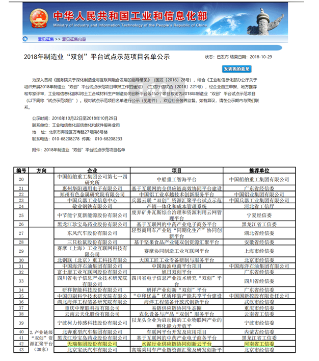 10月22日,工信部公示了2018年制造業(yè)“雙創(chuàng)”平臺(tái)試點(diǎn)示范項(xiàng)目名單。經(jīng)企業(yè)自主申報(bào)、地方推薦和專家評(píng)審,工信部擬將土工合成材料生產(chǎn)制造協(xié)同創(chuàng)新平臺(tái)等150個(gè)項(xiàng)目核定為2018年制造業(yè)“雙創(chuàng)”平臺(tái)試點(diǎn)示范項(xiàng)目。水泥行業(yè)中,天瑞集團(tuán)股份有限公司的水泥行業(yè)供應(yīng)鏈協(xié)同創(chuàng)新云平臺(tái)項(xiàng)目成功入選。公示時(shí)間為2018年10月22日至2018年10月29日。