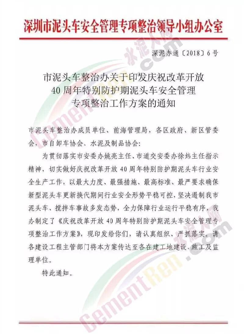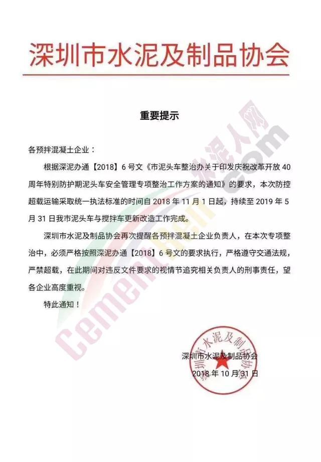 10月31日深圳市水泥及制品協(xié)會(huì)發(fā)布重要提示稱,根據(jù)深泥辦通【2018】6號(hào)文《市泥頭車整治辦關(guān)于印發(fā)慶祝改革開放40周年特別防護(hù)期泥頭車安全管理專項(xiàng)整治工作方案的通知》的要求,本次防控超載運(yùn)輸采取統(tǒng)一執(zhí)法標(biāo)準(zhǔn)的時(shí)間自2018年11月1日起,持續(xù)至2019年月31日,深圳市泥頭車與攪拌車更新改造工作完成。