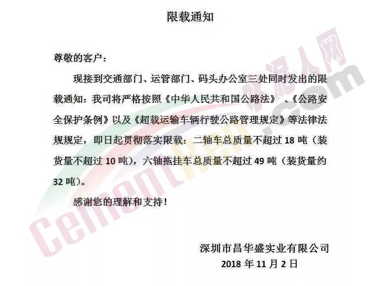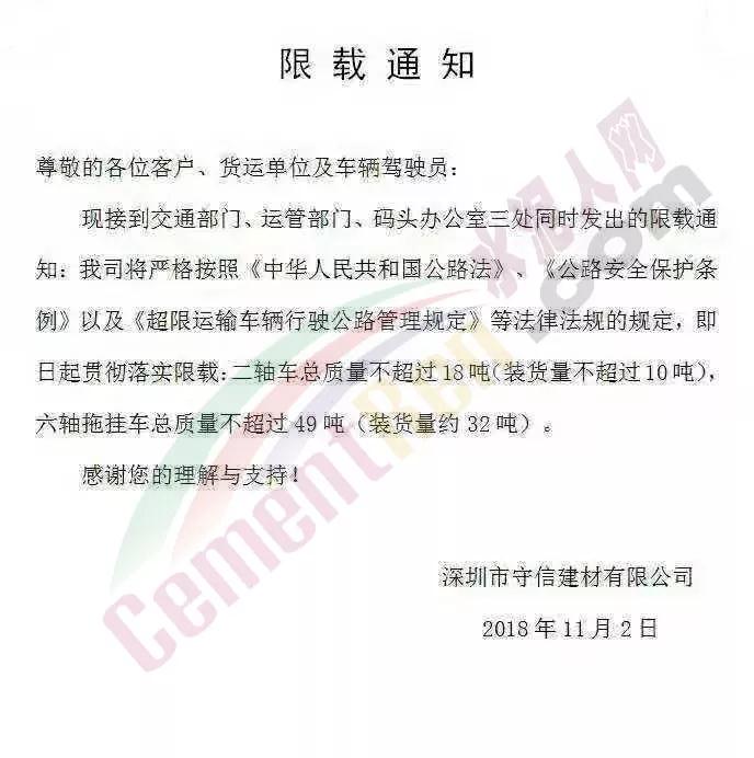 接到通知后,深圳市各區(qū)域建材相關(guān)企業(yè)紛紛下發(fā)通知,稱嚴(yán)格執(zhí)行相關(guān)文件要求。深圳市守信建材有限公司、深圳市昌華盛實(shí)業(yè)有限公司等企業(yè)發(fā)布限載通知稱,接到交通部門、運(yùn)管部門、碼頭辦公室三處同時(shí)發(fā)出的限載通知。公司將嚴(yán)格按照《中華人民共和國(guó)公路法》、《公路安全保護(hù)條例》以及《超限運(yùn)輸車輛行駛公路管理規(guī)定》等法律法規(guī)的規(guī)定,即日起貫徹落實(shí)限載:二軸車總質(zhì)量不超過18噸(裝貨量不超過10噸),六軸拖掛車總質(zhì)量不超過49噸(裝貨量約32噸)。原文如下: