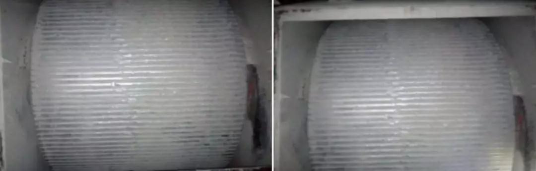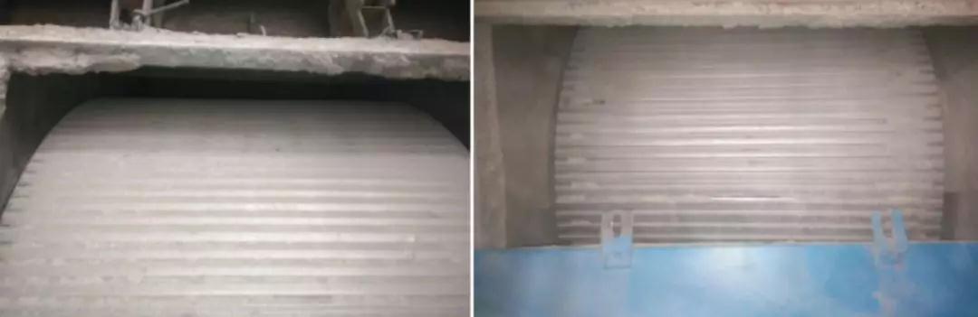 一、新材料合金輥優(yōu)秀的耐磨性。以 JM 公司為例,該公司是一條年產(chǎn) 200 萬噸水泥的全能生產(chǎn)線,配有兩套 170/100 輥壓機(jī)+Φ4.2×13m 水泥粉磨圈流系統(tǒng)。輥壓機(jī)輥?zhàn)釉褂枚押篙仯\(yùn)行功耗在 50~60%,入磨物料 R0.08 篩于 45%左右,2017 年 11 月改為新材料合金輥后,運(yùn)行功耗在 70-85%,入磨物料 R0.08篩于 25%左右,發(fā)揮出輥壓機(jī)的優(yōu)勢(shì),系統(tǒng)能力大幅度提高。輥壓機(jī)累計(jì)運(yùn)行7380 小時(shí)(期間輥面完好,相比于輥?zhàn)痈鼡Q前提高臺(tái)產(chǎn)約 20t/h)檢查輥面,條紋高度減少約 2.5mm,情況如圖: