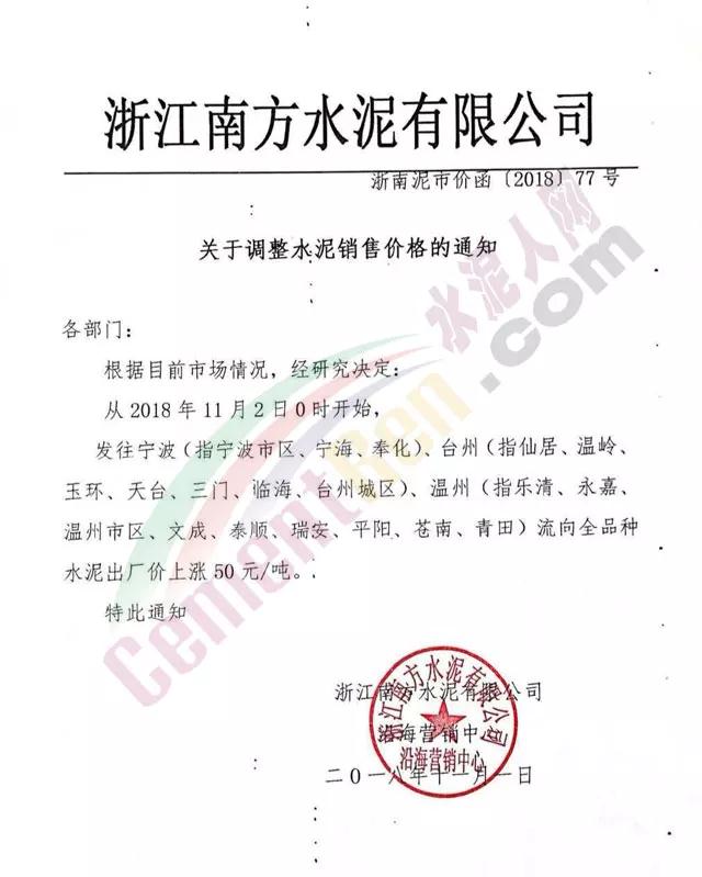 根據(jù)當(dāng)前錯(cuò)峰生產(chǎn)、市場(chǎng)行情及原材料價(jià)格上漲情況,經(jīng)公司研究決定,自2018年11月2日中午12時(shí)起,對(duì)PC32.5袋裝及散裝價(jià)格上調(diào)30元/噸;PO42.5袋、散裝、緩凝及52.5袋、散上調(diào)50元/噸。