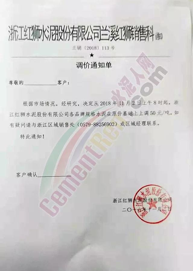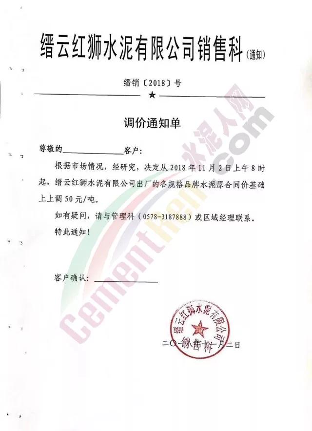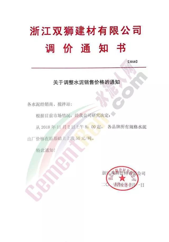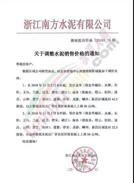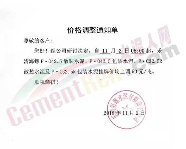根據(jù)當(dāng)前錯(cuò)峰生產(chǎn)、市場(chǎng)行情及原材料價(jià)格上漲情況,經(jīng)公司研究決定,自2018年11月2日上午8時(shí)起,對(duì)PC32.5袋裝及散裝價(jià)格上調(diào)30元/噸;PO42.5袋、散裝、緩凝及52.5袋、散上調(diào)50元/噸。