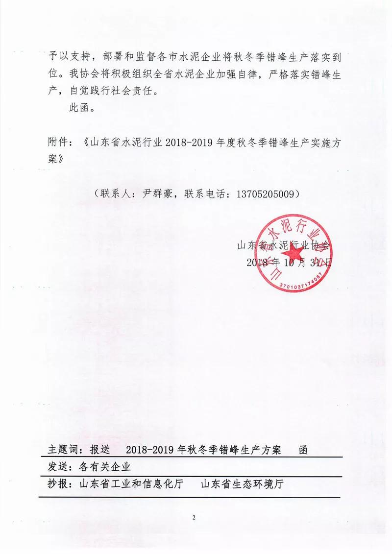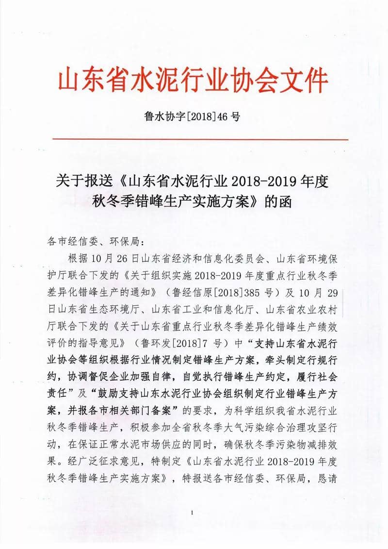 函件稱,根據(jù)10月26山東省經(jīng)信委、山東省環(huán)保廳聯(lián)合下發(fā)的《關(guān)于組織實(shí)施2018-2019年度重點(diǎn)行業(yè)秋冬季差異化錯(cuò)峰生產(chǎn)的通知》(魯經(jīng)信原【2018】38號(hào))及10月29日山東省多部門(mén)聯(lián)合下發(fā)的《關(guān)于山東省重點(diǎn)行業(yè)秋冬季差異化錯(cuò)峰生產(chǎn)績(jī)效評(píng)價(jià)的指導(dǎo)意見(jiàn)》(魯環(huán)發(fā)【2018】7號(hào))中“支持山東省水泥行業(yè)協(xié)會(huì)等組織根據(jù)行業(yè)情況制定錯(cuò)峰生產(chǎn)方案,牽頭制定行規(guī)行約,協(xié)調(diào)督促企業(yè)加強(qiáng)自律,自覺(jué)執(zhí)行錯(cuò)峰生產(chǎn)約定,履行社會(huì)責(zé)任”及“鼓勵(lì)支持山東水泥行業(yè)協(xié)會(huì)組織制定行業(yè)錯(cuò)峰生產(chǎn)方案,并報(bào)各市相關(guān)部門(mén)備案”的要求,為科學(xué)組織山東省水泥行業(yè)秋冬季錯(cuò)峰生產(chǎn),積極參加全省秋冬大氣污染綜合治理攻堅(jiān)行動(dòng),在保證正常水泥市場(chǎng)供應(yīng)的同時(shí),確保秋冬季污染物減排效果。經(jīng)廣泛征求意見(jiàn),特制定《山東省水泥行業(yè)2018-2019年度秋冬季錯(cuò)峰生產(chǎn)實(shí)施方案》,特報(bào)送各市經(jīng)信委、環(huán)保局、懇請(qǐng)予以支持,部署和監(jiān)督各市水泥企業(yè)將秋冬季錯(cuò)峰生產(chǎn)落實(shí)到位。協(xié)會(huì)將積極組織全省水泥企業(yè)加強(qiáng)自律,嚴(yán)格落實(shí)錯(cuò)峰生產(chǎn),自覺(jué)踐行社會(huì)責(zé)任。