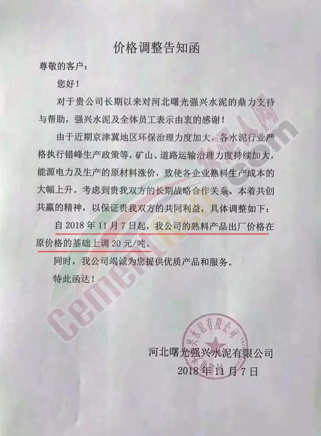 《價(jià)格調(diào)整告知函》稱,由于近期京津冀地區(qū)環(huán)保治理力度加大,各水泥行業(yè)嚴(yán)格執(zhí)行錯(cuò)峰生產(chǎn)政策。礦山、道路運(yùn)輸治理力度持續(xù)加大,能源電力及生產(chǎn)的原材料漲價(jià),致使各企業(yè)熟料生產(chǎn)成本大幅上升。 因此上調(diào)熟料出廠價(jià)格。價(jià)格調(diào)整告知函原文如下: