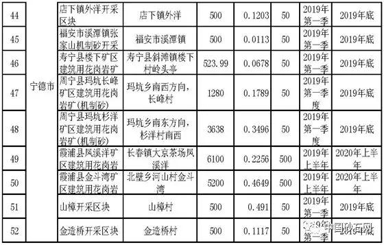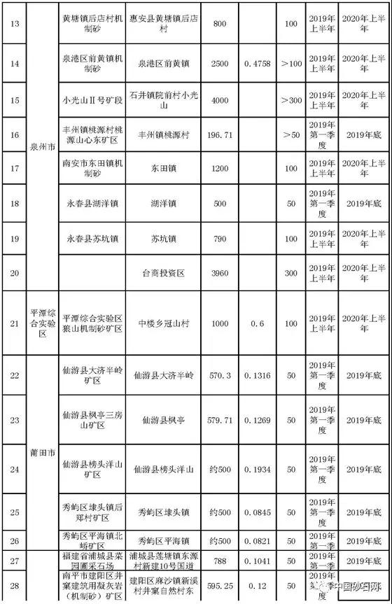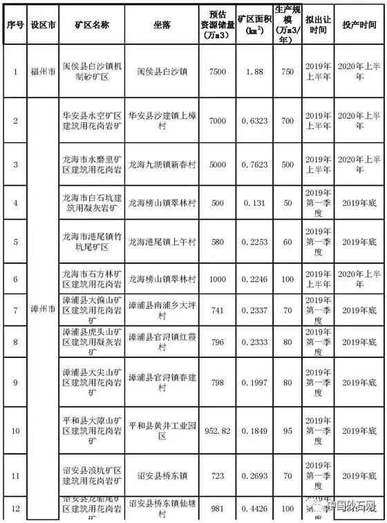 今天,《福建省國土資源廳 福建省住房和城鄉(xiāng)建設(shè)廳關(guān)于加快推進機制砂項目配套礦山采礦權(quán)出讓工作的通知》在福建省自然資源廳網(wǎng)站公示。其中附件中有:《各設(shè)區(qū)市擬設(shè)機制砂項目配套礦山基本情況一覽表》,一共有52家機制砂礦區(qū),投產(chǎn)時間段在2019年到2020年之間。