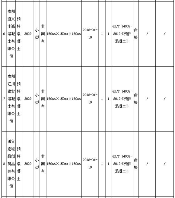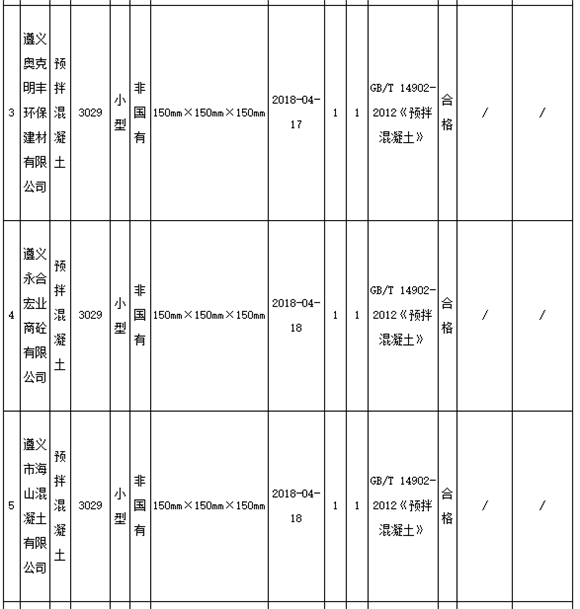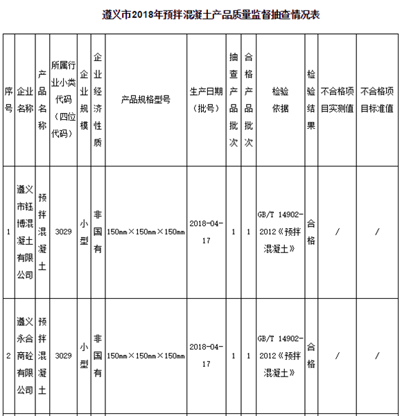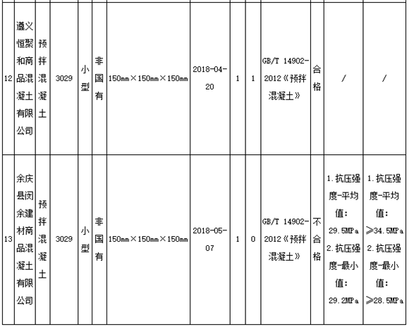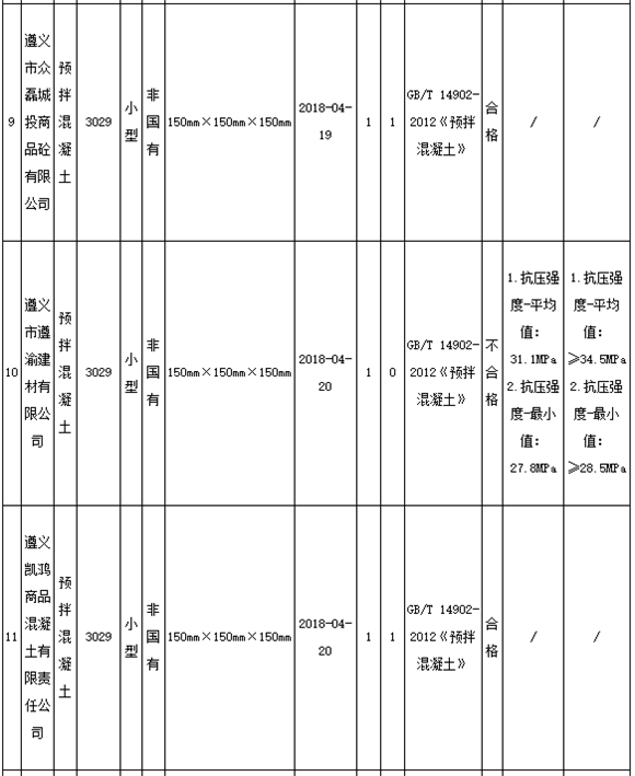 11月8日,貴州遵義市市場(chǎng)監(jiān)管局官網(wǎng)發(fā)布通告稱,為進(jìn)一步加大遵義市工業(yè)產(chǎn)品質(zhì)量監(jiān)督力度,確保產(chǎn)品質(zhì)量安全,近期組織對(duì)全市13家生產(chǎn)預(yù)拌混凝土企業(yè)共13個(gè)批次產(chǎn)品進(jìn)行抽檢。13家企業(yè)11批次產(chǎn)品合格,2批次產(chǎn)品不合格,合格率為84.6%。