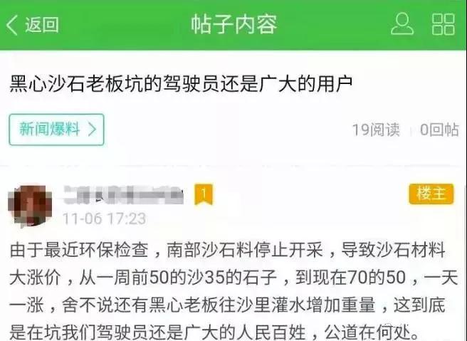 11月6日,有網(wǎng)友發(fā)帖稱“黑心砂石老板坑的是駕駛員還是廣大的用戶”,帖子內(nèi)容里講到:由于最近環(huán)保檢查,南部砂石料停止開采,導(dǎo)致砂石材料大漲價(jià),從一周前50的砂35的石子,漲到現(xiàn)在70的砂和50的石子,一天一漲。還有黑心老板往砂里灌水加重量。