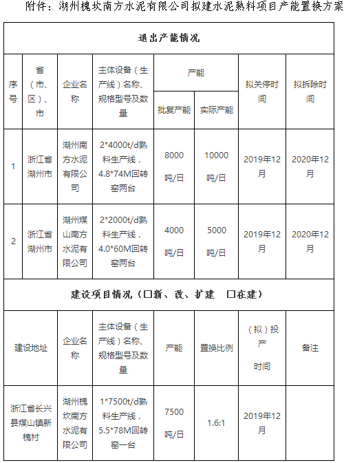 按照《國務(wù)院關(guān)于化解產(chǎn)能嚴(yán)重過剩矛盾的指導(dǎo)意見》和《工業(yè)和信息化部關(guān)于印發(fā)鋼鐵水泥玻璃行業(yè)產(chǎn)能置換實(shí)施辦法的通知》(工信部原[2017]337號)要求,湖州槐坎南方水泥有限公司新建7500噸/日熟料項(xiàng)目產(chǎn)能置換方案經(jīng)公示征求社會公眾意見后,予以公告。 浙江省經(jīng)濟(jì)和信息廳 2018年11月9日