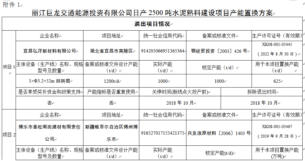 附件:1.麗江巨龍交通能源投資有限公司日產(chǎn)2500噸水泥熟料建設(shè)項目產(chǎn)能置換方案