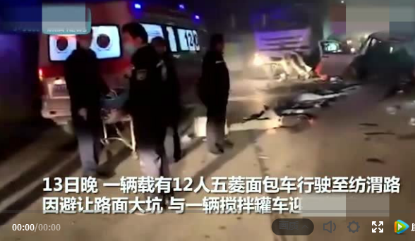 @華商報 11月13日消息,據(jù)讀者剛剛反映,“今晚,一輛載有12人的陜A西安牌照五菱面包車,由南向北行駛至紡渭路窯村附近時遇路面大坑,緊急避讓間與由北向南行駛的一輛攪拌罐車迎面相撞”。記者初步了解,該路段無路燈,常行渣土車。路面大坑為渣土車碾壓形成。事發(fā)時間為當(dāng)晚20時許,面包車超載,車上12人都是附近工地的工人。具體事故原因與傷亡情況待進(jìn)一步確認(rèn)。