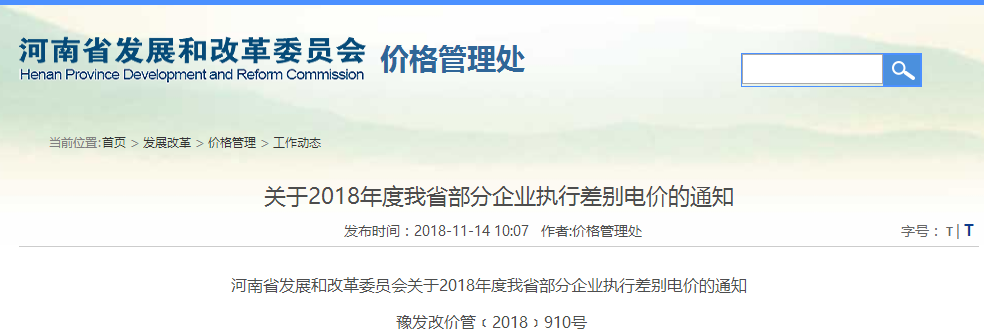五、各地價格主管部門要會同有關(guān)部門按照省政府辦公廳《關(guān)于完善差別化電價政策的通知》(豫政辦明電〔2018〕99號)等文件要求,加強對差別化電價的核查、執(zhí)行和監(jiān)督檢查,確保差別化電價政策落實到位。省電力公司要將本次差別電價執(zhí)行情況于2019年2月底前報送我委(價管處)。