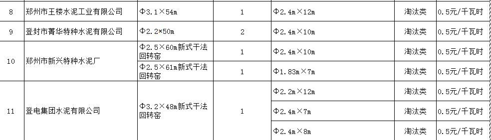 三、鄭州中泰水泥有限公司等9家企業(yè)的部分生產(chǎn)設(shè)施屬淘汰類項目(見附表),自2018年6月1日抄見電量至2018年10月31日期間,用電加價0.3元/千瓦時;自2018年11月1日起,用電加價0.5元/千瓦時。