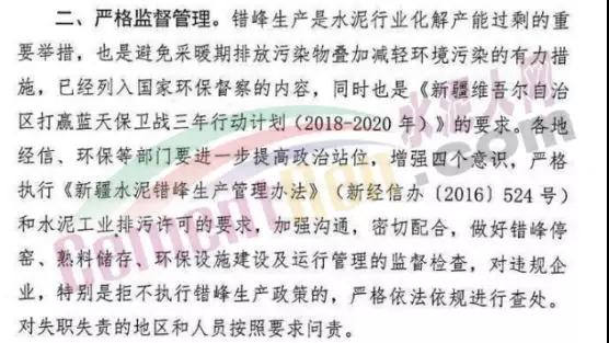 根據(jù)新疆環(huán)保廳、工信委、建設(shè)兵團環(huán)保局聯(lián)合發(fā)布的《關(guān)于2018-2019年冬季水泥錯峰生產(chǎn)的通知》相關(guān)要求,對違規(guī)企業(yè)、特別是拒不執(zhí)行錯峰生產(chǎn)政策的,嚴格依法依規(guī)進行查處。對失職失責(zé)的地區(qū)和人員按照要求問責(zé)。
