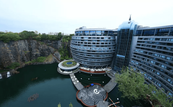 這座深坑酒店選址在舊礦場形成的深坑,依附深坑巖壁而建。其中地上2層,地上裙房1層地下室,坑內(nèi)16層,其中水下永久2層。