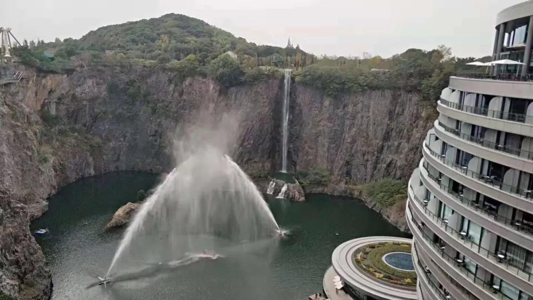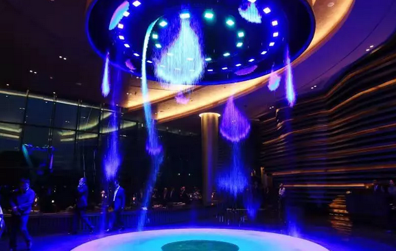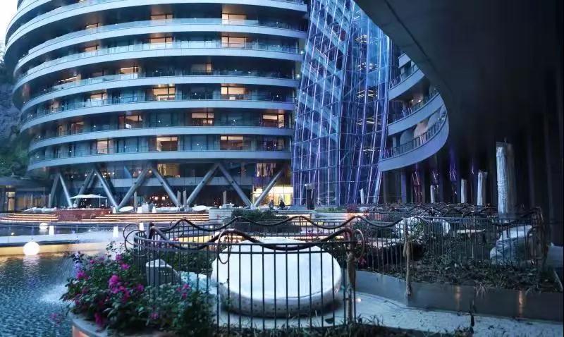 而該酒店另一大景觀則是大型景觀瀑布,從懸崖上垂掛而下,和酒店中央的玻璃瀑布幕墻構(gòu)成了一個壯觀呼應(yīng)的景觀。