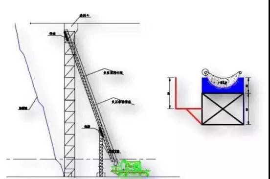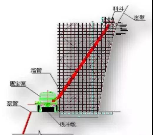 方案一:研發(fā)一套具有高效緩沖效果的固定泵管,將其固定于崖壁上,采用一泵到底技術(shù)輸送混凝土;