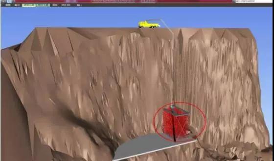 2)通過汽車泵BIM模型結(jié)合崖壁模型選擇泵車最佳布置點(diǎn),既北側(cè)-50m平臺上方,可避開泵管與崖壁碰撞處實(shí)現(xiàn)爆破量=0,且斷面較規(guī)則可作為溜槽搭設(shè)位置;
