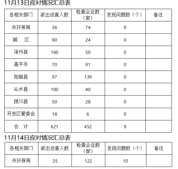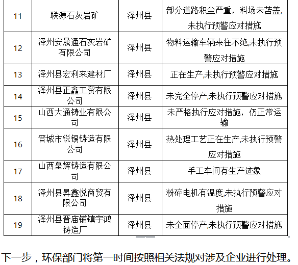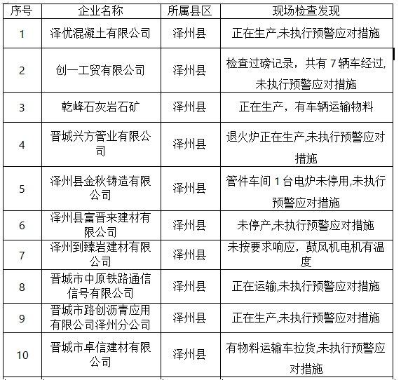 收到預(yù)警通知后,為確保所有應(yīng)對(duì)措施能夠落實(shí)到位,晉城市環(huán)保局緊急安排部署,分13個(gè)組,聯(lián)合城區(qū)、澤州縣、開(kāi)發(fā)區(qū)環(huán)保部門(mén),奔赴晉城市各重點(diǎn)區(qū)域進(jìn)行巡查。截至14日16時(shí),晉城市、縣兩級(jí)環(huán)保部門(mén)共檢查企業(yè)574家,多數(shù)企業(yè)按照相關(guān)預(yù)案積極響應(yīng)并執(zhí)行預(yù)警應(yīng)對(duì)措施,但仍有19家企業(yè)未完全落實(shí)應(yīng)對(duì)措施。