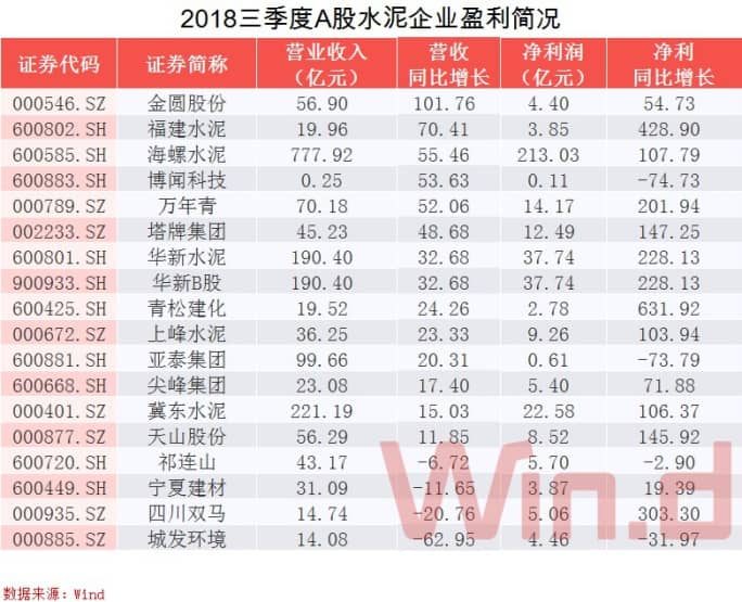 WIND數(shù)據(jù)顯示,今年前三季度,水泥板塊共實現(xiàn)營業(yè)收入1719.89億元,同比增長33.45%;凈利潤329.28億元,同比增長115.61%。公司方面,有統(tǒng)計數(shù)據(jù)的 12 家上市公司中,凈利潤漲幅超過一倍的共有 8 家,其中海螺水泥和中國建材以絕對優(yōu)勢領(lǐng)先其他企業(yè),2018 年前三季度分別實現(xiàn)凈利潤 213 億元和 121 億元,同比上漲 108%和 210%,冀東水泥、華新水泥和萬年青漲幅明顯,分別為 496%、228%和 202%。