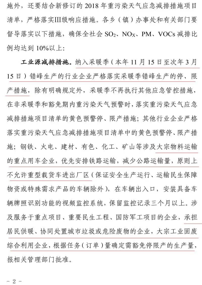 工業(yè)源減排措施。納入采暖季(本年 11 月 15 日至次年 3 月15 日)錯峰生產(chǎn)的行業(yè)企業(yè)嚴(yán)格落實(shí)采暖季錯峰生產(chǎn)的停、限產(chǎn)措施,除有明確規(guī)定外,采暖季不再執(zhí)行其他應(yīng)急管控措施,在非采暖季和豁免期內(nèi)重污染天氣預(yù)警時,落實(shí)重污染天氣應(yīng)急減排措施項(xiàng)目清單的黃色預(yù)警停、限產(chǎn)措施;