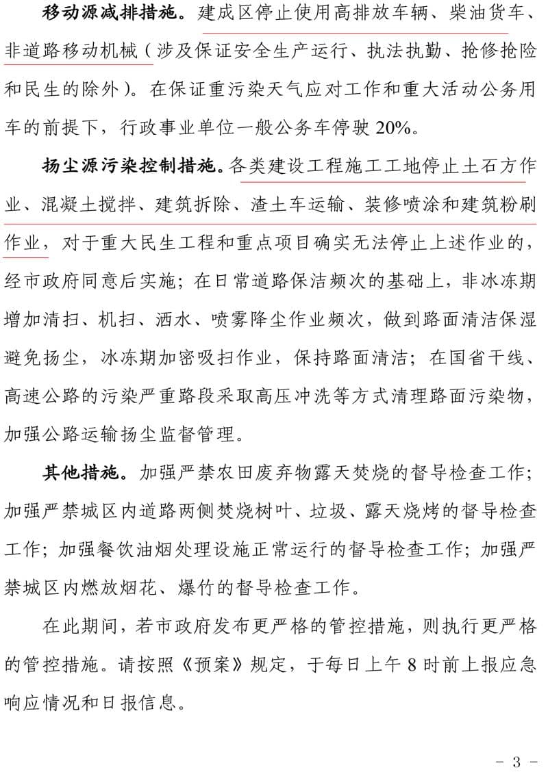 揚(yáng)塵源污染控制措施。各類建設(shè)工程施工工地停止土石方作業(yè)、混凝土攪拌、建筑拆除、渣土車運(yùn)輸、裝修噴涂和建筑粉刷作業(yè),對于重大民生工程和重點(diǎn)項(xiàng)目確實(shí)無法停止上述作業(yè)的,經(jīng)市政府同意后實(shí)施;