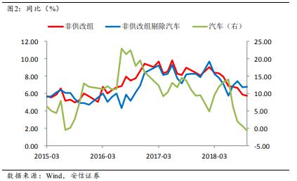 作為與真實經濟更為相關的非供改組的走勢值得進一步深入探討。汽車行業(yè)占比較大,而且今年以來波動較大,可能對整體數據有干擾。如果我們把非供改組剔除汽車以后,實際上非供改組的生產走勢自7月份以來保持平穩(wěn)。