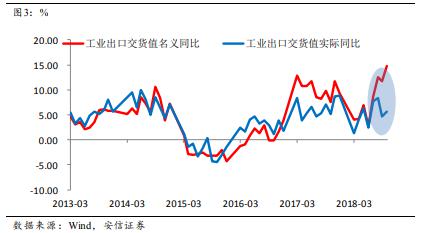 這與市場的感官認知有一定的差異,也與之前一路下降的走勢不一致。我們認為,7-10月出口出現了明顯的反彈,支撐了7-10月的工業(yè)生產。由于人民幣貶值,出口名義值反彈明顯;但即使從實際值看,7-10月的工業(yè)出口實際增速為6.6%,比3-6月的3.5%多增了3%;如果按照出口占工業(yè)生產的30%粗略估計,這四個月出口的回升拉升了工業(yè)增加值增速將近一個百分點。
