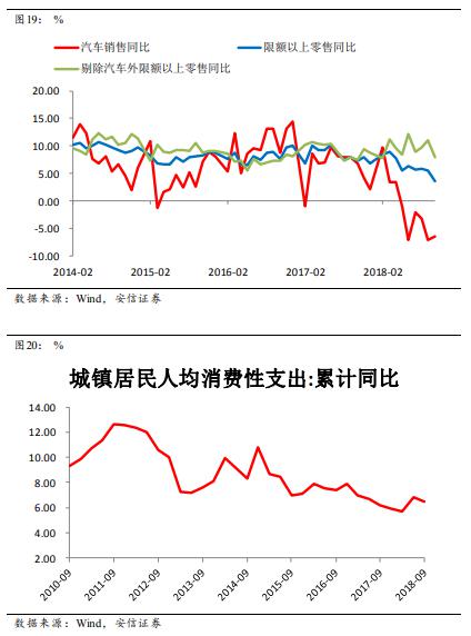 今年以來社會消費品零售總額和限額以上零售同比下滑明顯,很大程度上是受到汽車銷售大幅下滑的影響。如果剔除汽車部分,限額以上零售的其他部分同比增速甚至略有上行。但10月汽車銷售跌幅收窄,同時限額以上零售增速明顯放緩,使得去除汽車的其他消費出現了下滑。但這個下滑是否持續(xù)還需要進一步觀察。另外,從城鎮(zhèn)居民人均消費支出這個指標上看,暫時沒有明顯看到消費有大幅下滑的跡象。