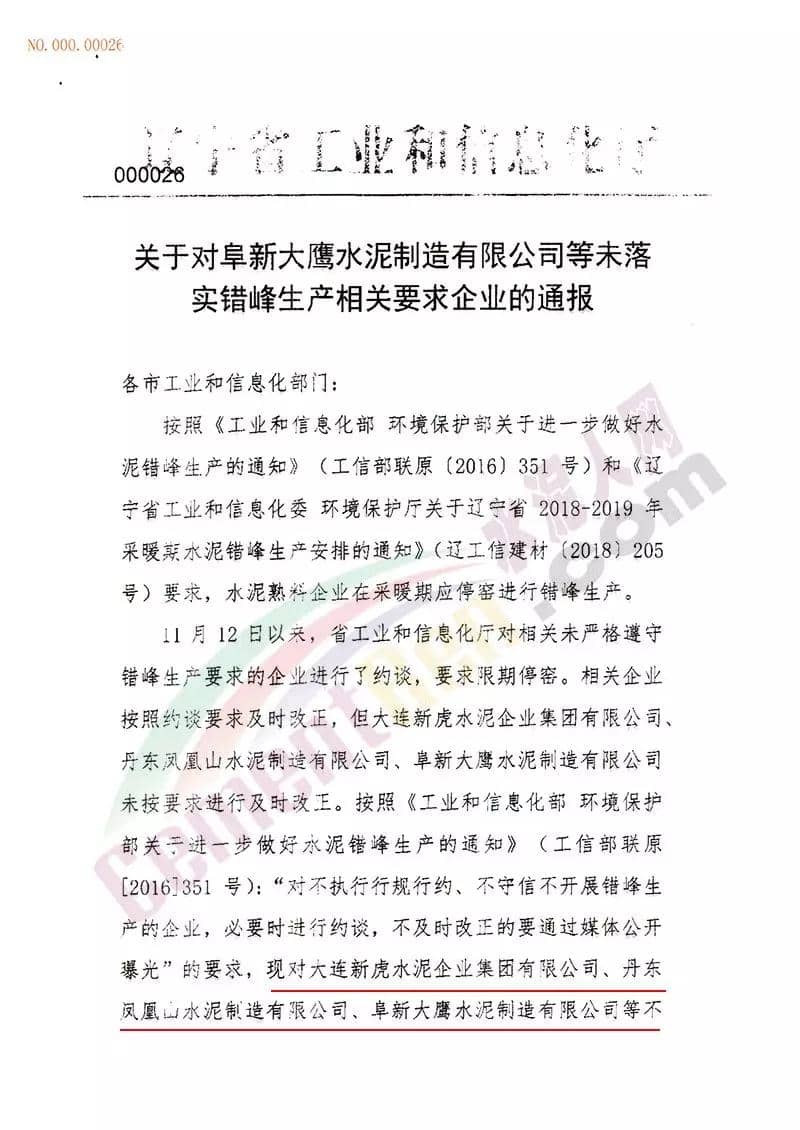11月12日以來,遼寧省工業(yè)和信息化廳對相關(guān)未嚴(yán)格遵守錯(cuò)峰生產(chǎn)要求的企業(yè)進(jìn)行了約談,要求限期停窯。相關(guān)企業(yè)按照約談要求及時(shí)改正,但大連新虎水泥企業(yè)集團(tuán)有限公司、丹東鳳凰山水泥制造有限公司、阜新大鷹水泥制造有限公司未按要求進(jìn)行及時(shí)改正。按照《工業(yè)和信息化部 環(huán)境保護(hù)部關(guān)于進(jìn)一步做好水泥錯(cuò)峰生產(chǎn)的通知》(工信部聯(lián)原【2016】351號):“對不執(zhí)行行規(guī)行約、不守信不開展錯(cuò)峰生產(chǎn)的企業(yè),必要時(shí)進(jìn)行約談,不及時(shí)改正的要通過媒體公開曝光”的要求,現(xiàn)在對大連新虎水泥企業(yè)集團(tuán)有限公司、丹東鳳凰山水泥制造有限公司、阜新大鷹水泥制造有限公司等不執(zhí)行錯(cuò)峰生產(chǎn)以及不及時(shí)改正的行為予以通報(bào)。