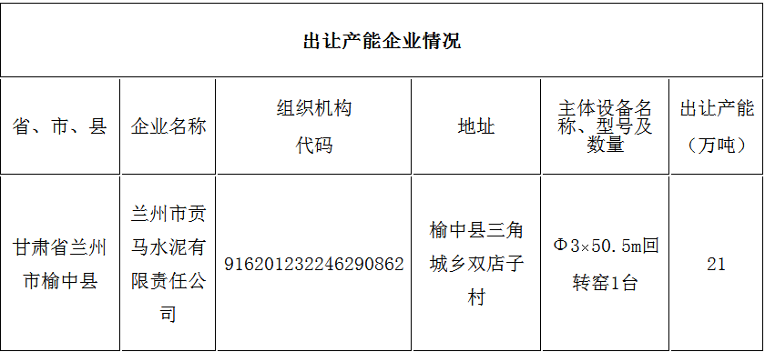 按照《國務(wù)院關(guān)于化解產(chǎn)能嚴(yán)重過剩矛盾的指導(dǎo)意見》(國發(fā)〔2013〕41號)、《工業(yè)和信息化部關(guān)于印發(fā)鋼鐵水泥玻璃行業(yè)產(chǎn)能置換實施辦法的通知》(工信部產(chǎn)業(yè)〔2017〕337號)和《甘肅省工業(yè)和信息化委員會關(guān)于做好鋼鐵水泥等行業(yè)產(chǎn)能置換工作的通知》(甘工信發(fā)〔2018〕241號)要求,現(xiàn)將蘭州市貢馬水泥有限責(zé)任公司水泥熟料產(chǎn)能出讓情況予以公示,歡迎社會公眾進(jìn)行監(jiān)督。