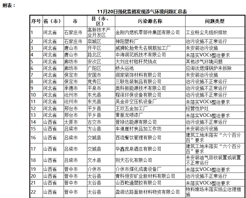 四、工業(yè)企業(yè)未安裝大氣污染防治設(shè)施問題20個。
