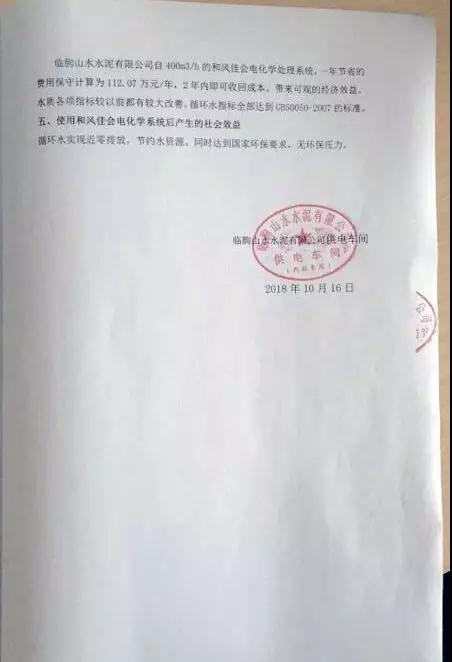 四、綜上,臨朐山水水泥有限公司自使用400m³/h的和風(fēng)佳會(huì)電化學(xué)處理系統(tǒng),一年節(jié)省的費(fèi)用約為76.76萬元/年,帶來可觀的經(jīng)濟(jì)效益。水質(zhì)各項(xiàng)指標(biāo)較以前都有較大改善,循環(huán)水指標(biāo)全部達(dá)到GB50050-2007的標(biāo)準(zhǔn)。