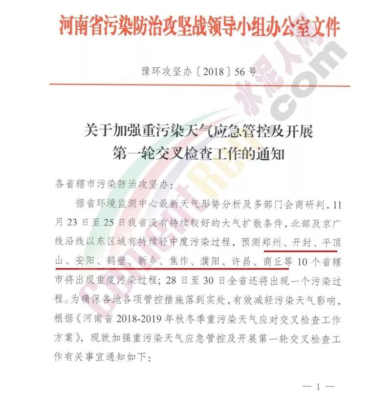 為確保各地各項管理措施落到實處,有效減輕污染天氣影響,根據(jù)《河南省2018-2019年秋冬季重污染天氣應(yīng)對交叉檢查工作方案》,就加強(qiáng)重污染天氣應(yīng)急管控及開展第一輪交叉檢查工作。