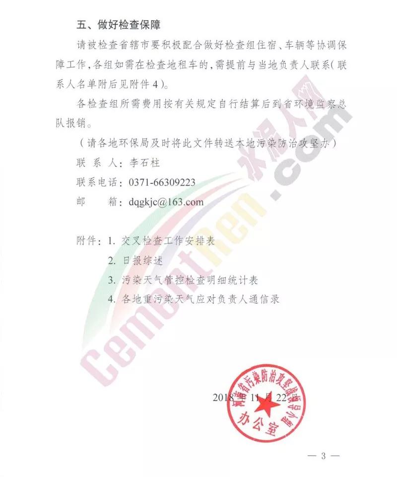 水泥人網(wǎng)最新消息,昨日(22日)河南省污染防治攻堅戰(zhàn)領(lǐng)導(dǎo)小組辦公室發(fā)布《關(guān)于加強(qiáng)重污染天氣應(yīng)急管控及開展第一輪交叉檢查工作的通知》(豫環(huán)攻堅辦【2018】56號文件。文件稱,根據(jù)河南省環(huán)境監(jiān)測中心最新天氣形勢分析及多部門會商研判,11月23日至25日河南省沒有持續(xù)較好的大氣擴(kuò)散條件,北部及京廣線沿線以東區(qū)域有持續(xù)輕中度污染過程,預(yù)測鄭州、開封、平頂山、安陽、鶴壁、新鄉(xiāng)、焦作、濮陽、許昌、商丘等10個省轄市將出現(xiàn)重度污染過程;28日至30日全省還將出現(xiàn)一個污染過程。