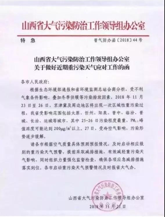 11月23日至26日,京津冀及周邊地區(qū)將出現(xiàn)一次區(qū)域性重污染過(guò)程,山西省受影響范圍包括太原、忻州、陽(yáng)泉、晉中、臨汾、晉城、長(zhǎng)治、運(yùn)城等城市,其中25日至26日污染程度最重,PM2.5峰值濃度可能達(dá)到200微克每立方米以上。