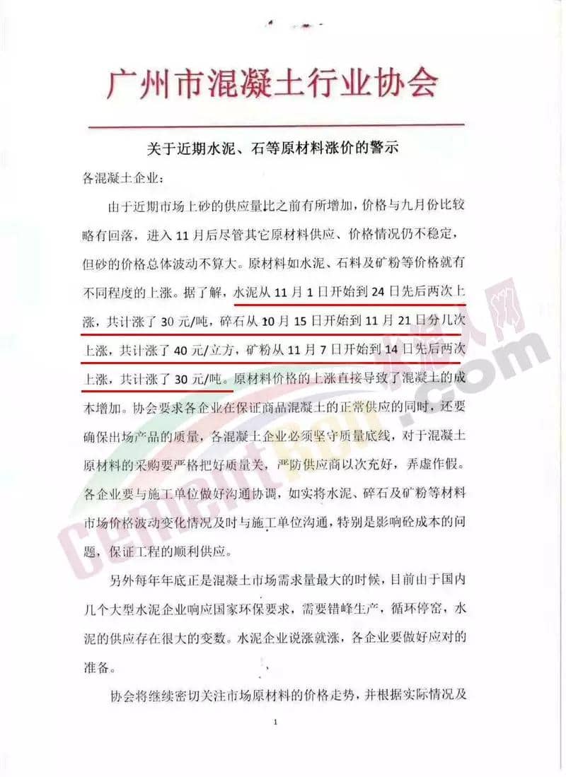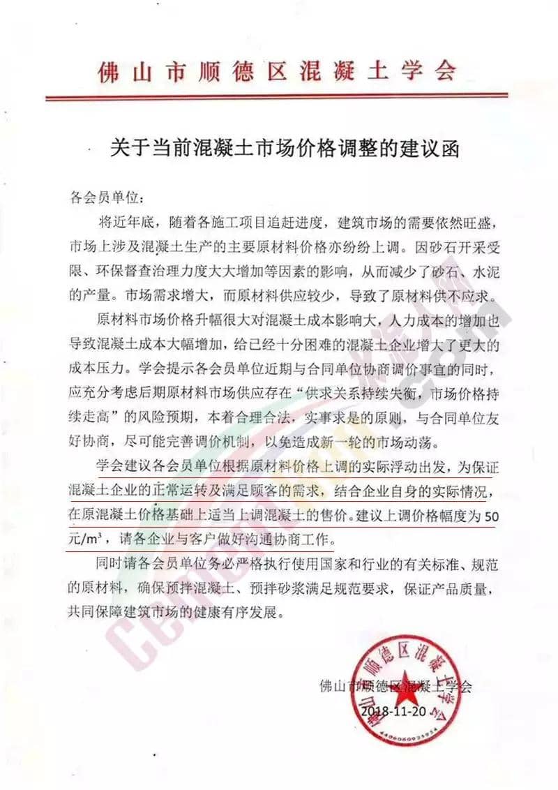 同一天,廣東省佛山市順德區(qū)混凝土學(xué)會(huì)發(fā)布了《關(guān)于當(dāng)前混凝土市場(chǎng)價(jià)格調(diào)整的建議函》。建議函稱將近年底,隨著各項(xiàng)施工項(xiàng)目追趕進(jìn)度,建筑市場(chǎng)的需要依然旺盛,市場(chǎng)上涉及混凝土生產(chǎn)的主要原材料價(jià)格亦紛紛上調(diào),且供不應(yīng)求,同時(shí)疊加人力成本的增加,使混凝土企業(yè)的成本壓力增大。