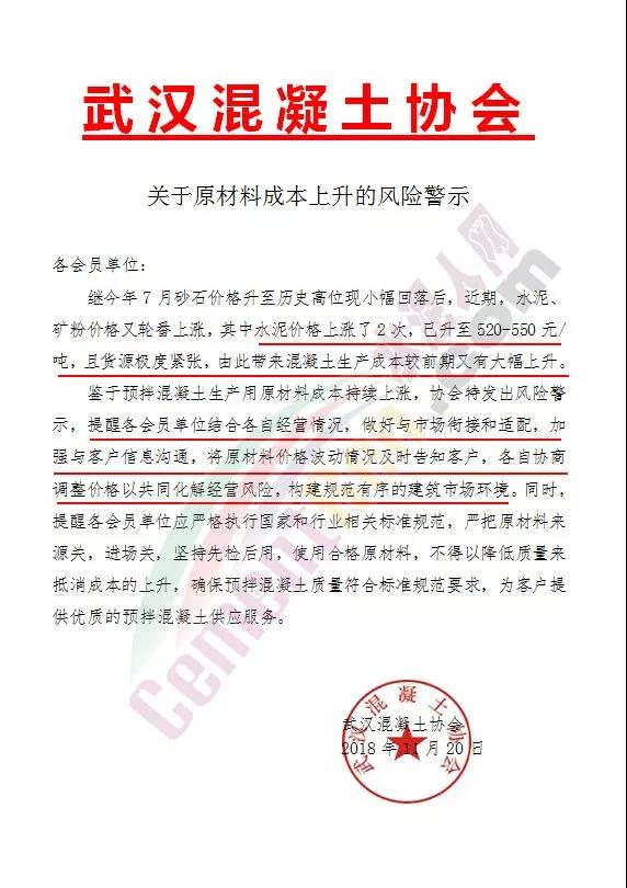 此前,武漢混凝土協(xié)會(huì)也曾發(fā)布預(yù)警通知稱,繼今年7月砂石價(jià)格升至歷史高位現(xiàn)小幅回落后。近期,水泥、礦粉價(jià)格又輪番上漲,其中水泥價(jià)格上漲2次,已升至520-550元/噸,且貨源極度緊張,由此帶來混凝土生產(chǎn)成本較前期又有大幅上升,鑒于預(yù)拌混凝土生產(chǎn)用原材料成本持續(xù)上漲,協(xié)會(huì)特發(fā)出風(fēng)險(xiǎn)警示。