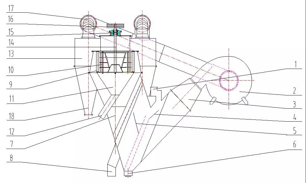 1.進料口;2.風(fēng)機;3. V選進風(fēng)口;4.打散板;5.分級板;6.粗砂出口;7.中砂集料錐;8.中砂出口;9. 弧形導(dǎo)流板;10.籠形轉(zhuǎn)達子;11.細砂收集錐;12.細砂出口;13.旋風(fēng)收塵器;14.傳動軸;15.軸承;16.皮帶輪;17.旋風(fēng)收塵器出風(fēng)管;18.細粉出口
