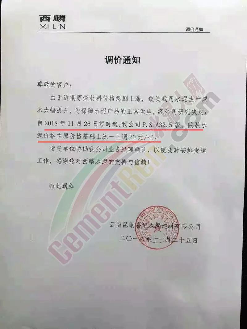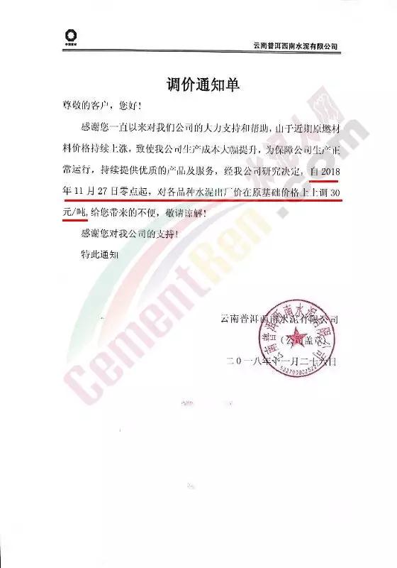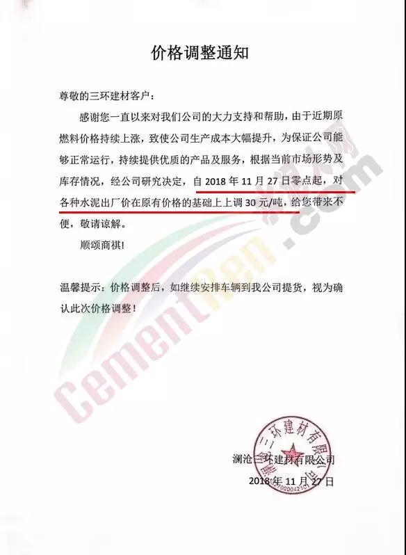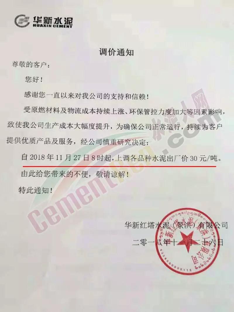 同期云南瀾滄三環(huán)建材有限公司和景洪市勐養(yǎng)靈象水泥建材有限公司也同步上調(diào)了水泥價格。調(diào)價通知如下: